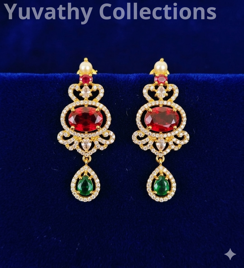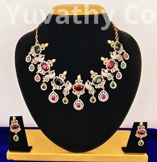 Matte Finishing AD Red and Green Stone Necklace fitted with pearl with back chain.
