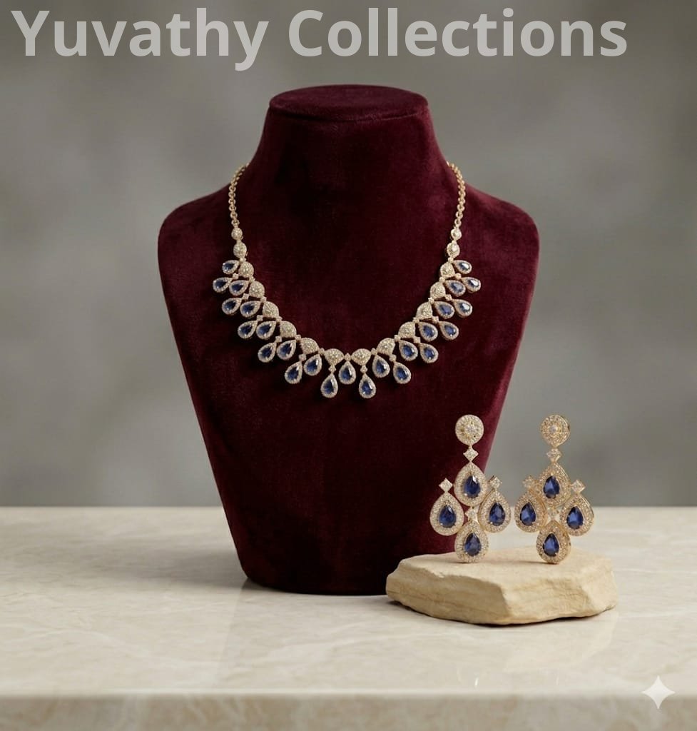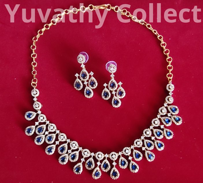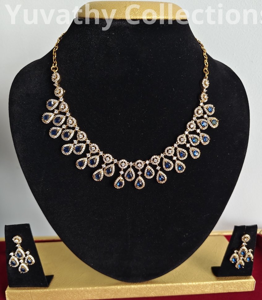 Matte finishing AD Stone Necklace Navy Blue and white colour stone jwellery with back chain.